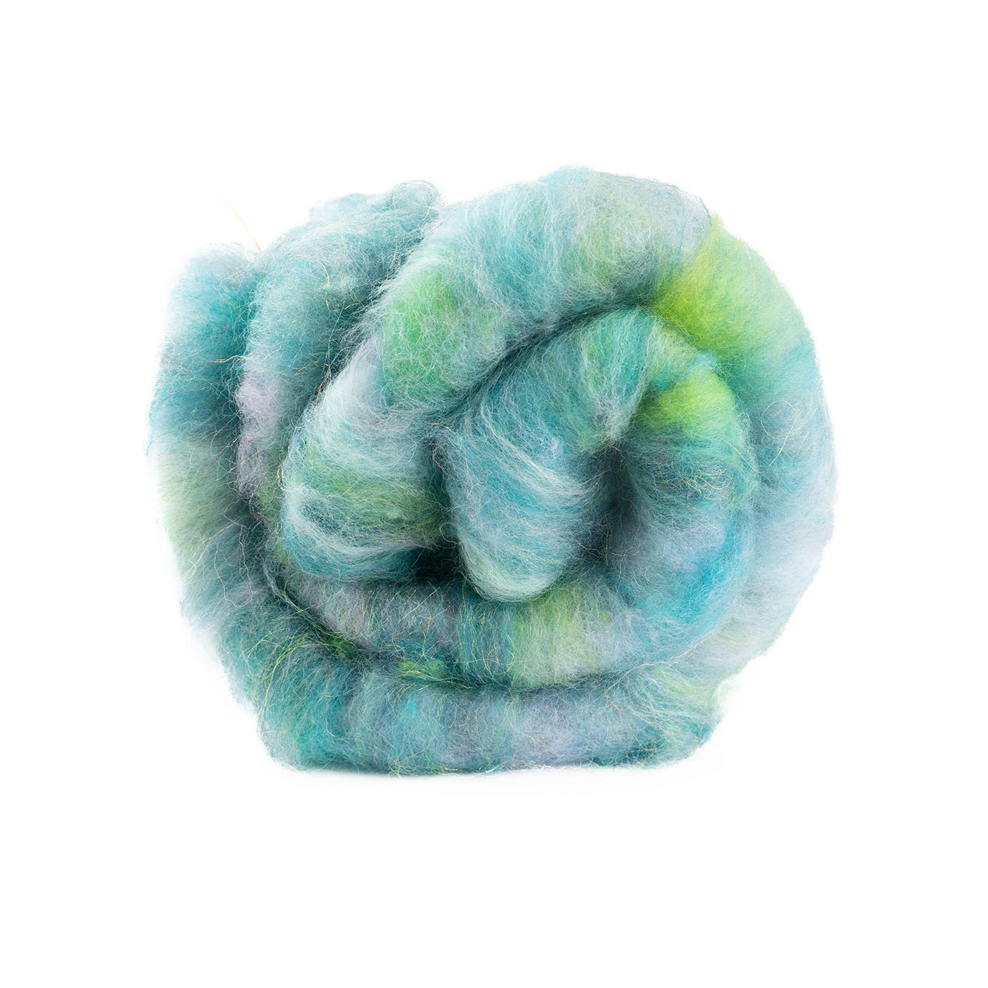 Hand-carded batts weighing approx. 50 g, made from a unique mix of fibers such as merino, silk, mohair, and sari silk. Smooth to spin, with endless options for texture and color variation.